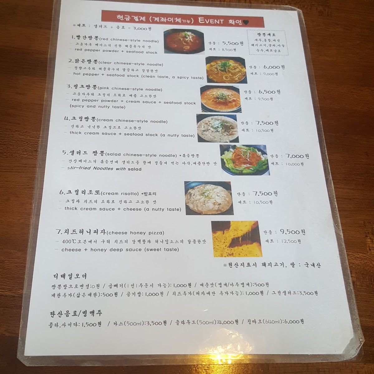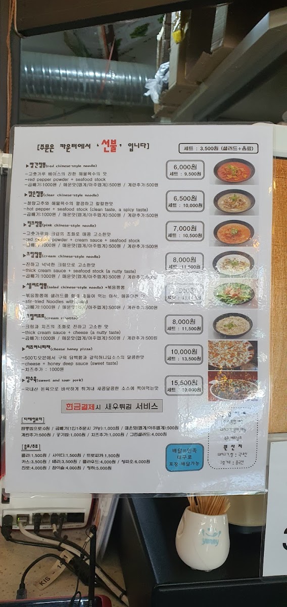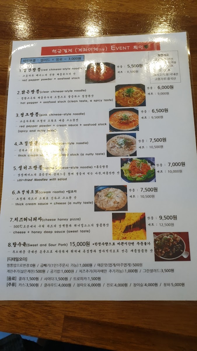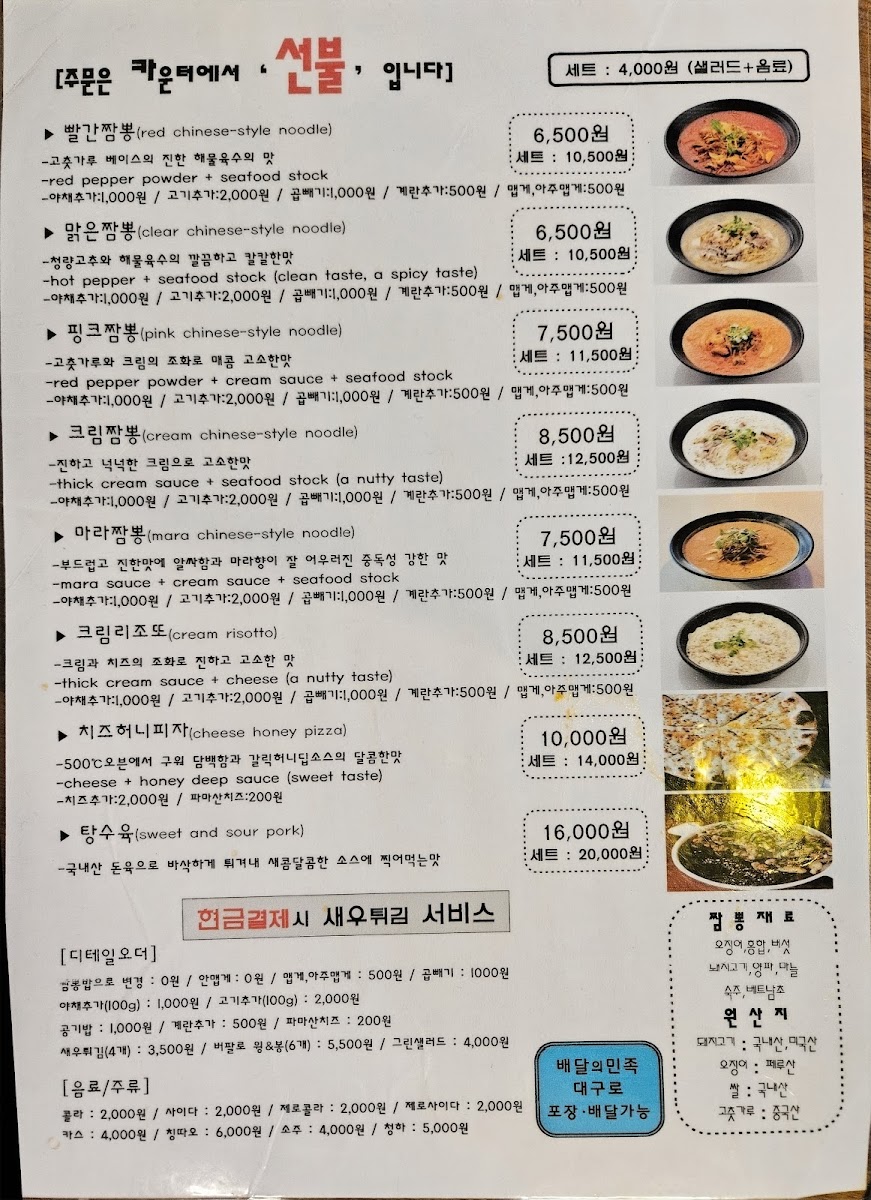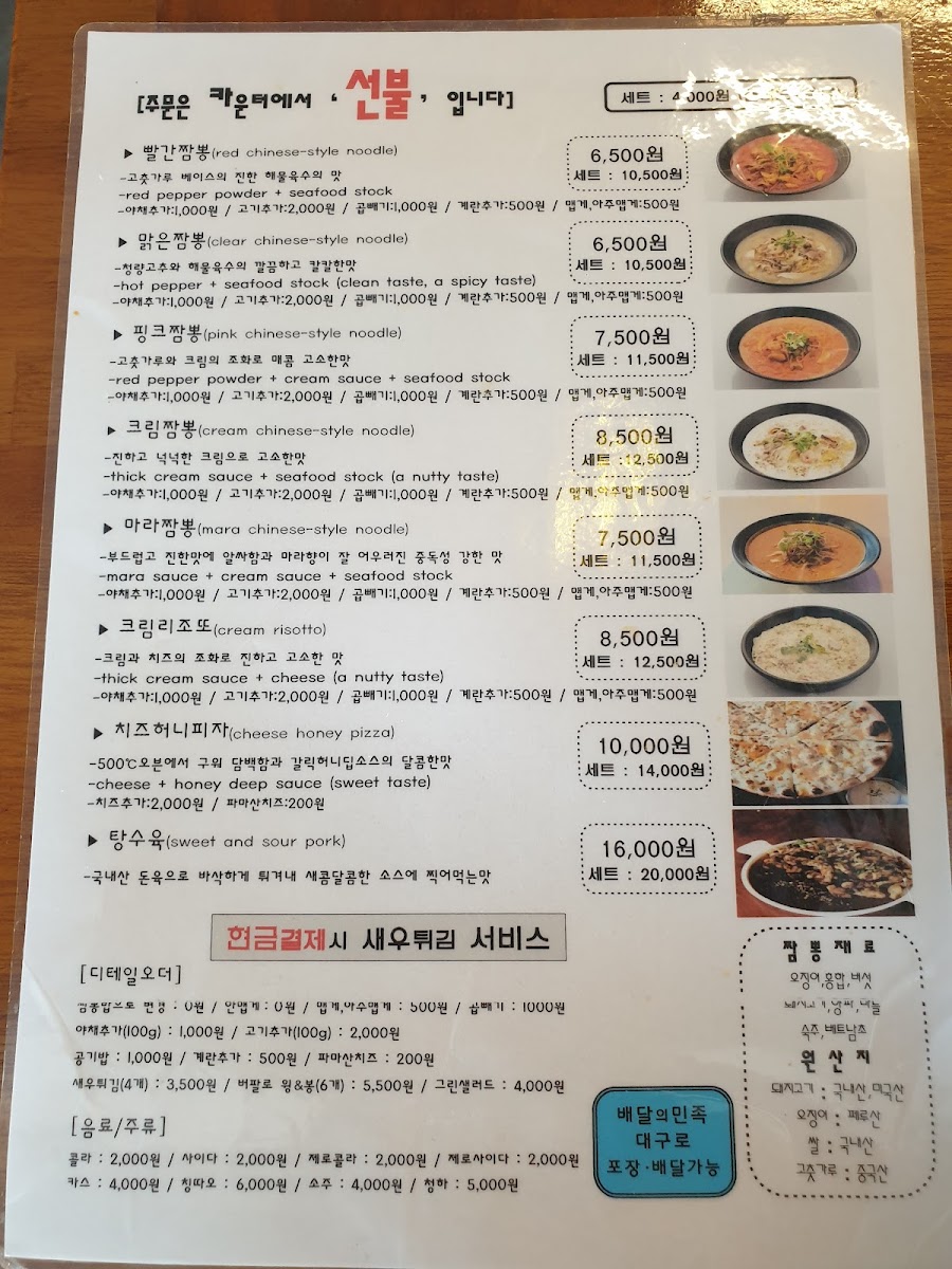 For those dining in groups, set menus like 핑크짬뽕세트 and 핑크짬뽕제일맛있음 세트랑 피자랑 are practical choices, bundling the restaurant’s most popular items into a cohesive meal, often complemented by 세트콜라 for a casual, complete experience. Overall, the menu succeeds in offering variety without losing focus, emphasizing signature jjamppong styles and fun fusion sides that define the restaurant’s identity.